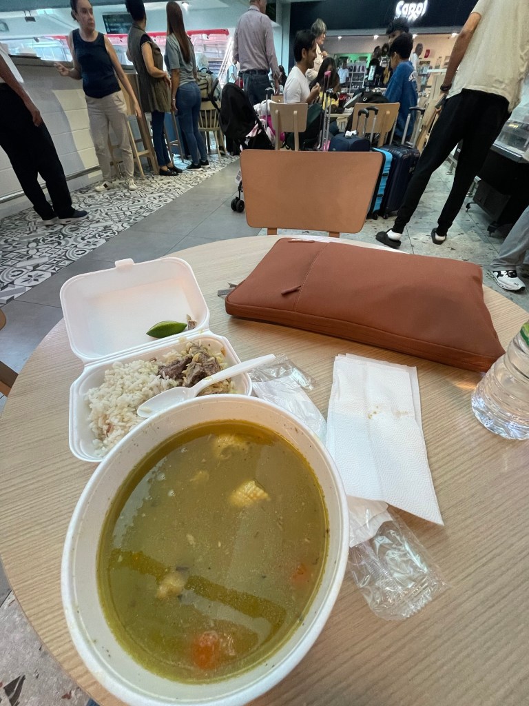 While at the first airport in Santo Domingo the Good News was shared personal by person as the Holy Spirit led and out loud in the areas the Holy Spirit placed me and in the airplane as boarding and walking to the last seat in the airplane. People would say Amen and thank you with some staying quiet or just smiling. A meal of Sancocho was shared with a man who works at the airport, together with the message of the Good News in the paper, which he started sharing with his other coworkers.